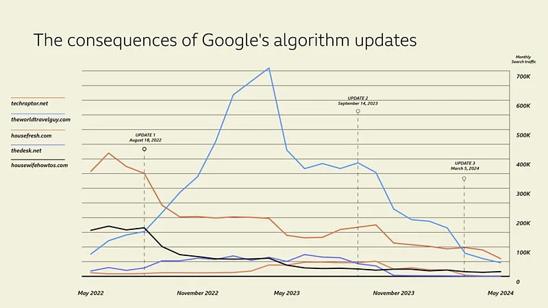 Over the last two years, updates meant to make Search more “helpful” devastated many website owners who say they follow Google’s best practices. (Source: Semrush) (Credit: BBC)